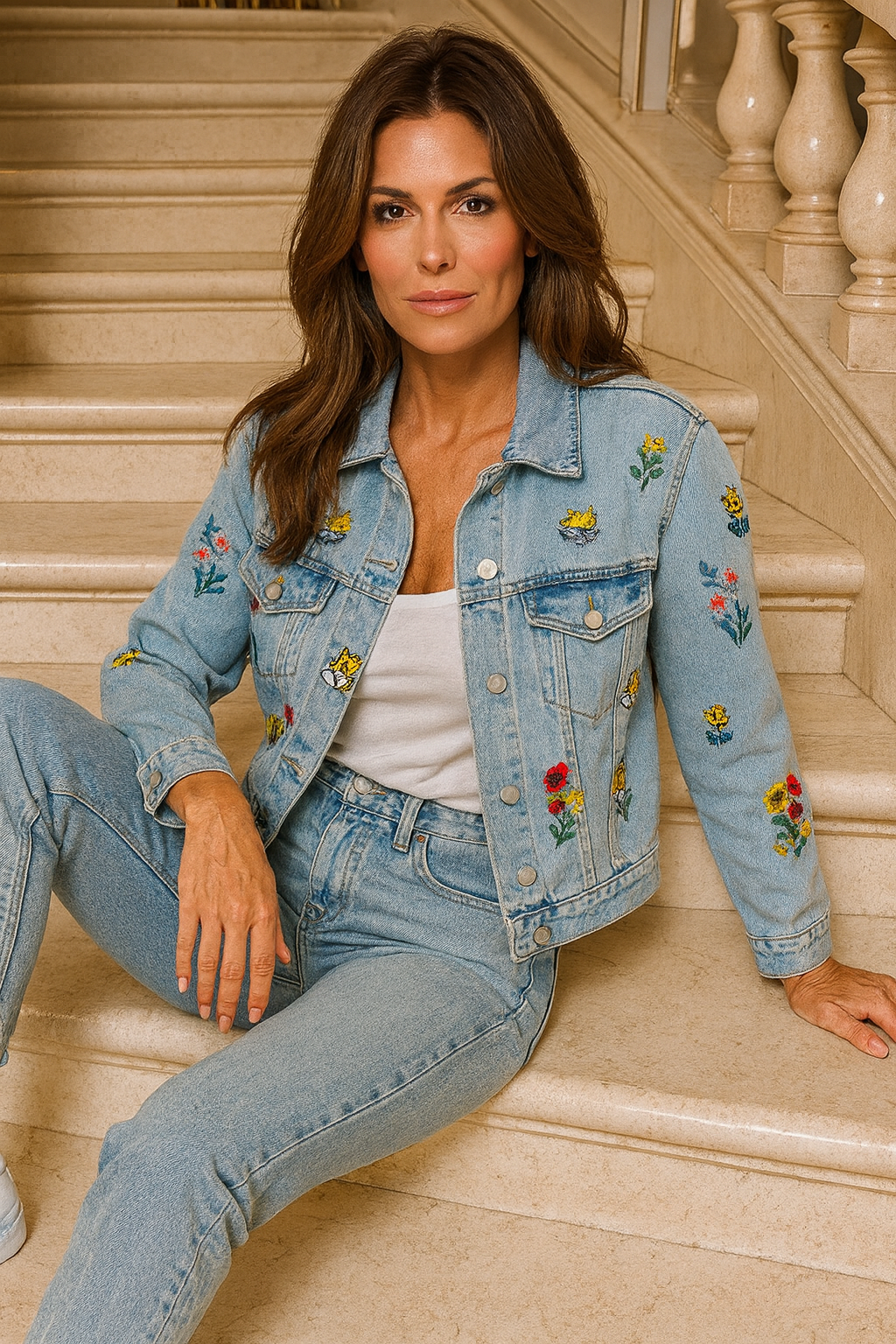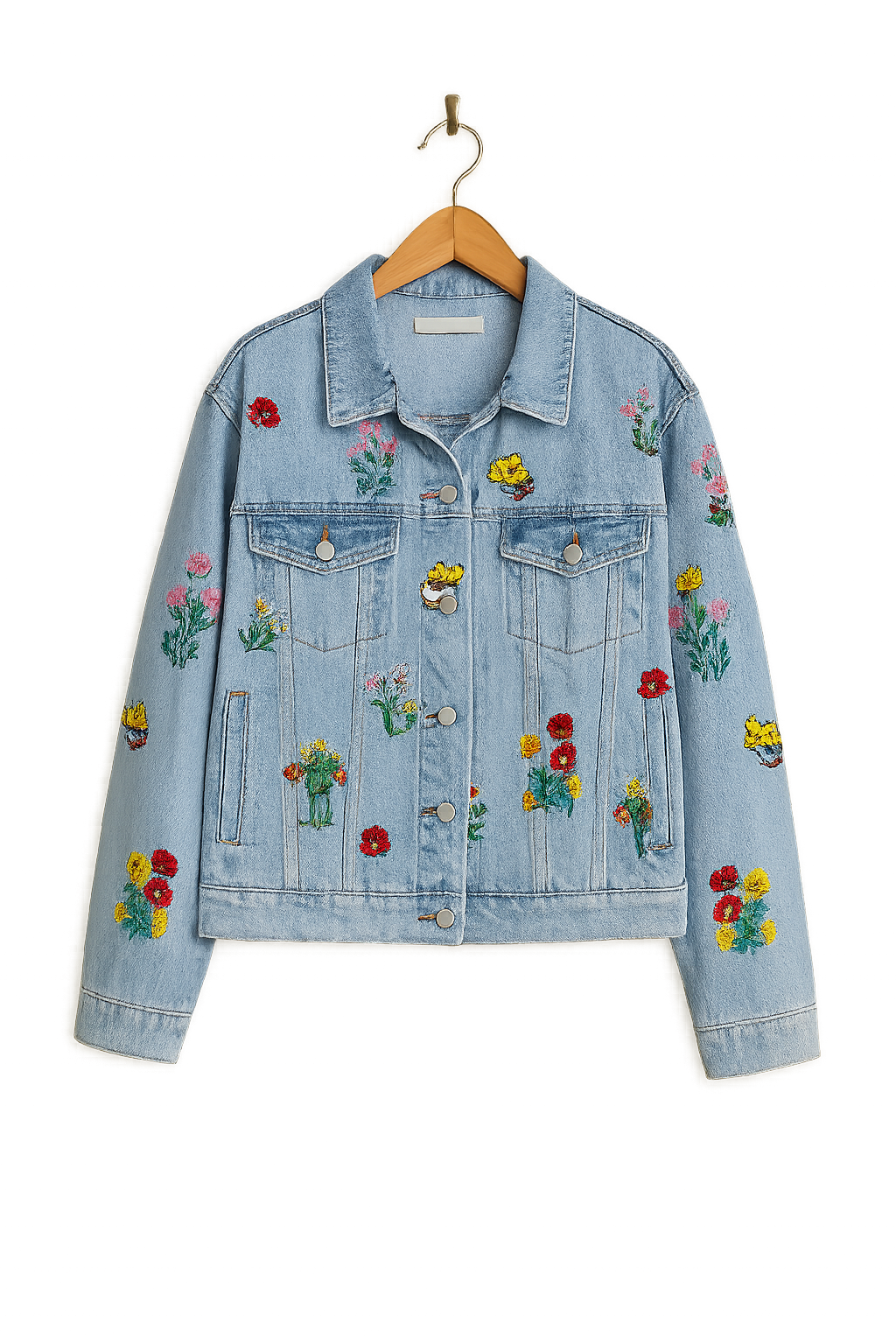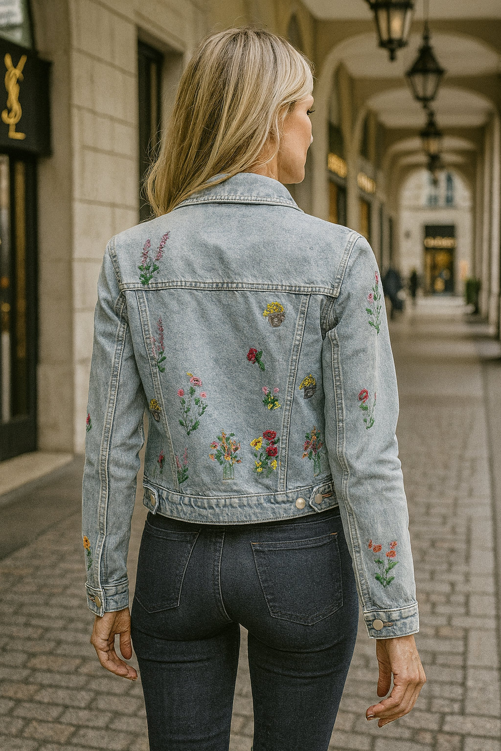 Kombinieren Sie die florale Jeansjacke mit einem fließenden Sommerkleid und Boots für einen coolen Stilbruch. Oder tragen Sie sie ganz klassisch zu weißem Shirt und Sneakern – lassen Sie die Blumen für sich sprechen!
