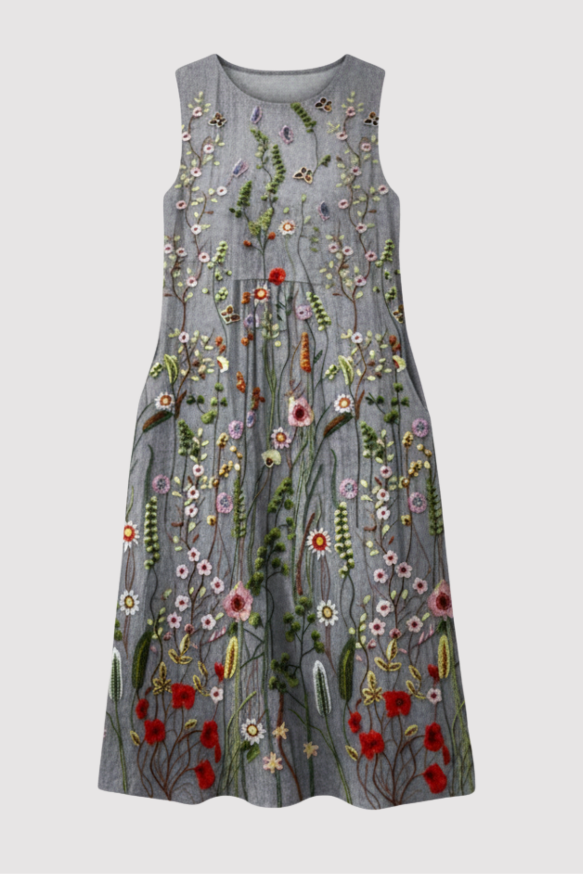 Ein luftiges, ärmelloses Kleid mit zartem Blumenmuster. Weich, feminin und perfekt, um warme Tage mit Leichtigkeit zu geniessen.