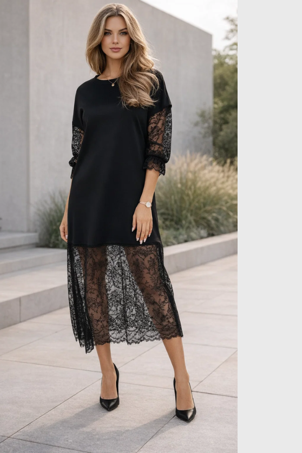 Die durchsichtigen Spitzenärmel und der Spitzenbesatz am Saum verleihen dem Kleid einen Hauch von raffiniertem Charme, sodass Sie Ihren Stil mit einem subtilen Anflug von Verführung für jeden Anlass, von Tag bis Nacht, zur Geltung bringen können.