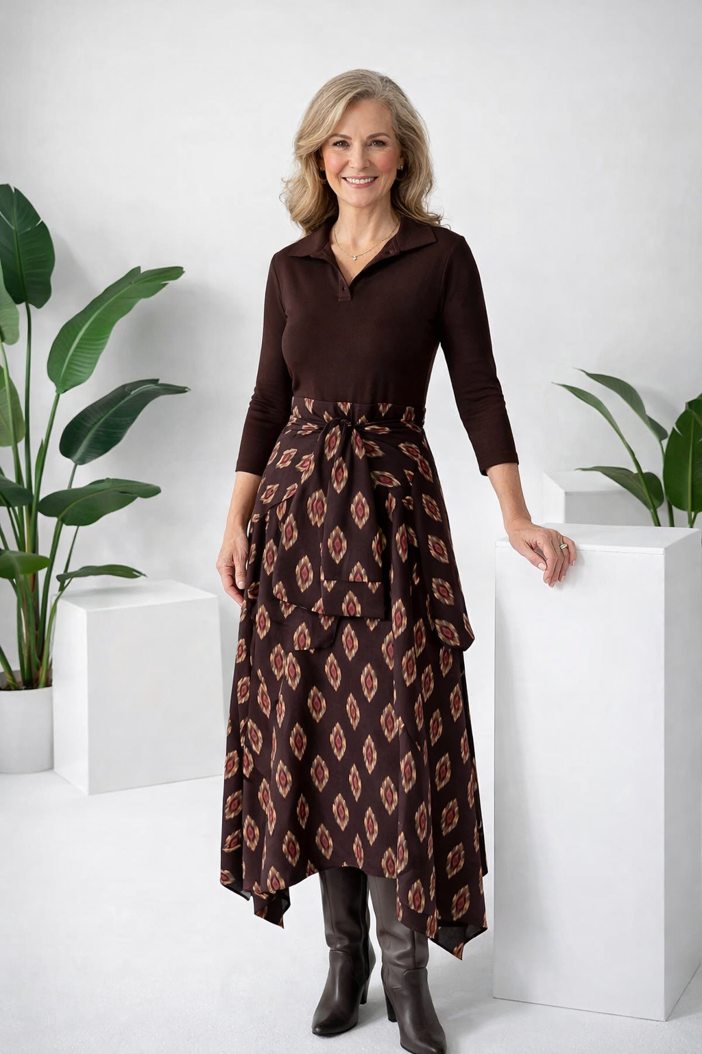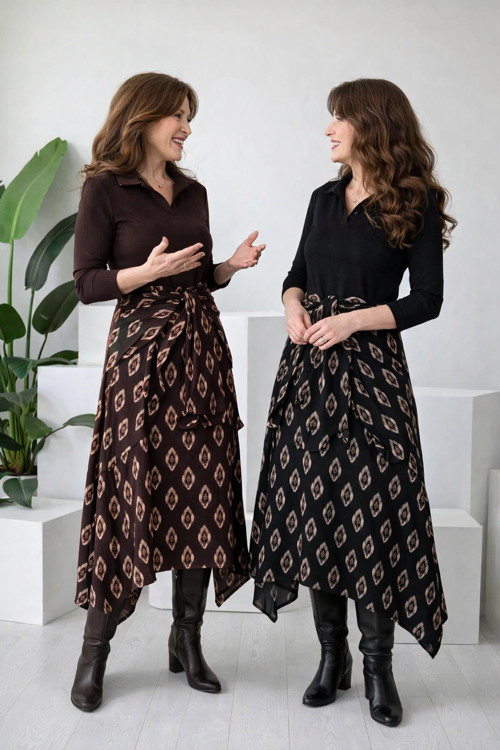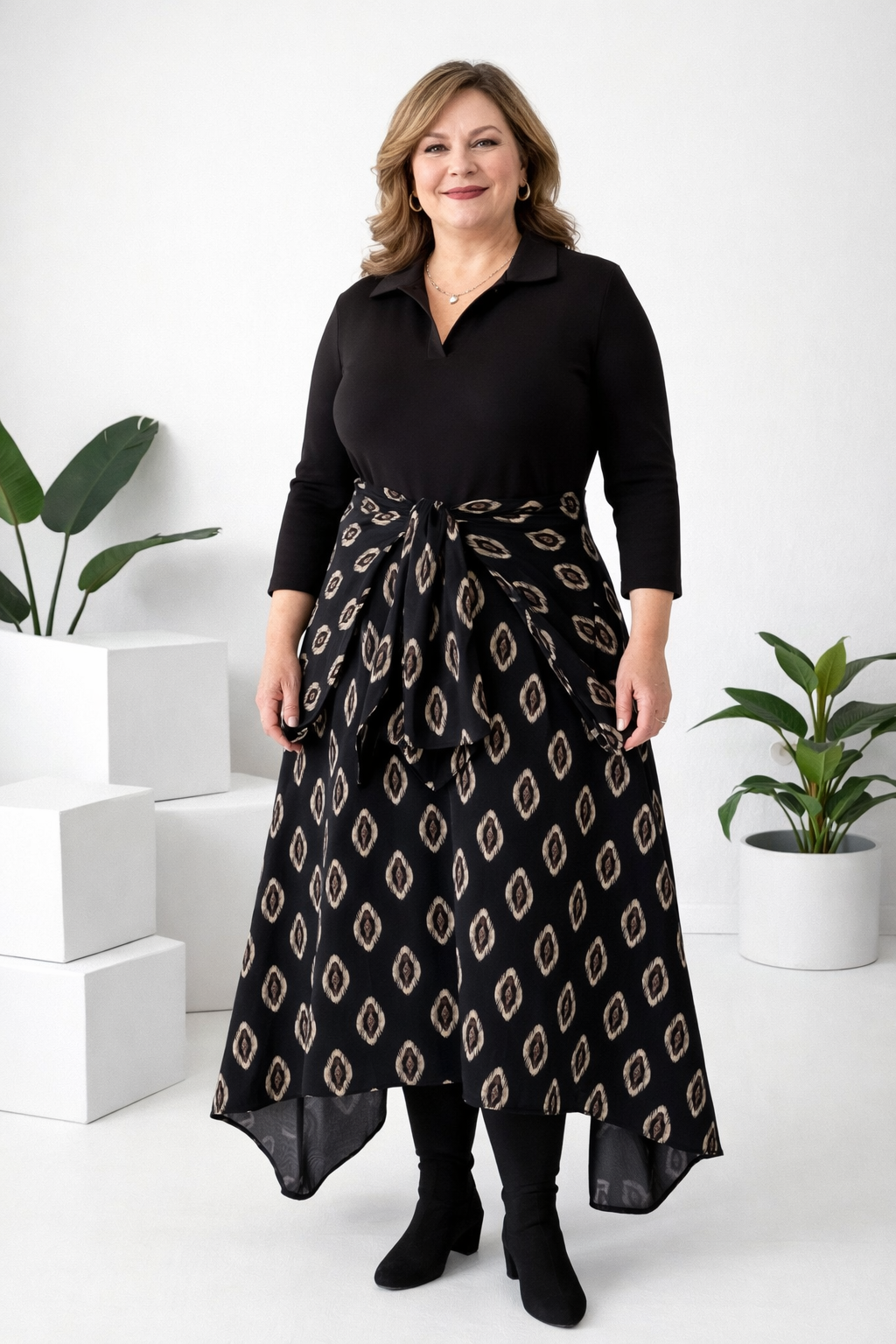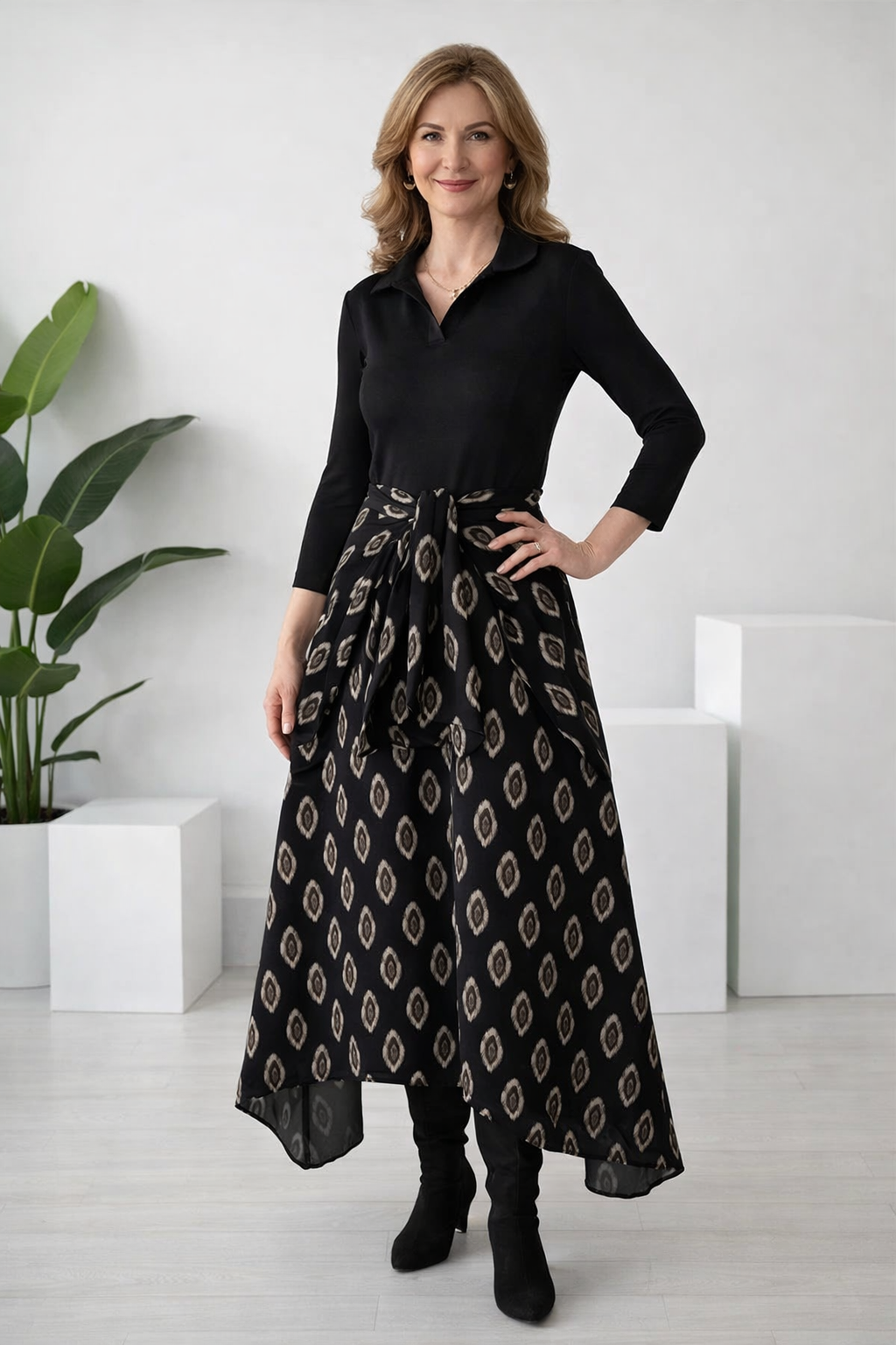 ZWEIFARBIGES DESIGN- Dieses Kleid kombiniert einen einfarbigen Oberteil mit einem gemusterten Rock und schafft so einen schicken, koordinierten Zweiteiler-Look. Dieses clevere Design bietet visuelles Kontrast und Tiefe, wodurch es ein mühelos stilvolles und komplettes Outfit ist.