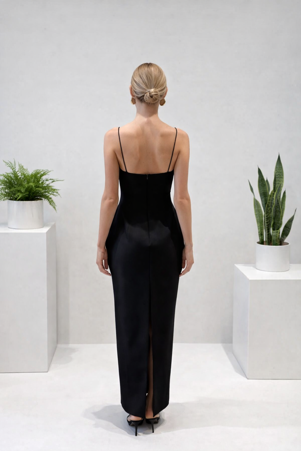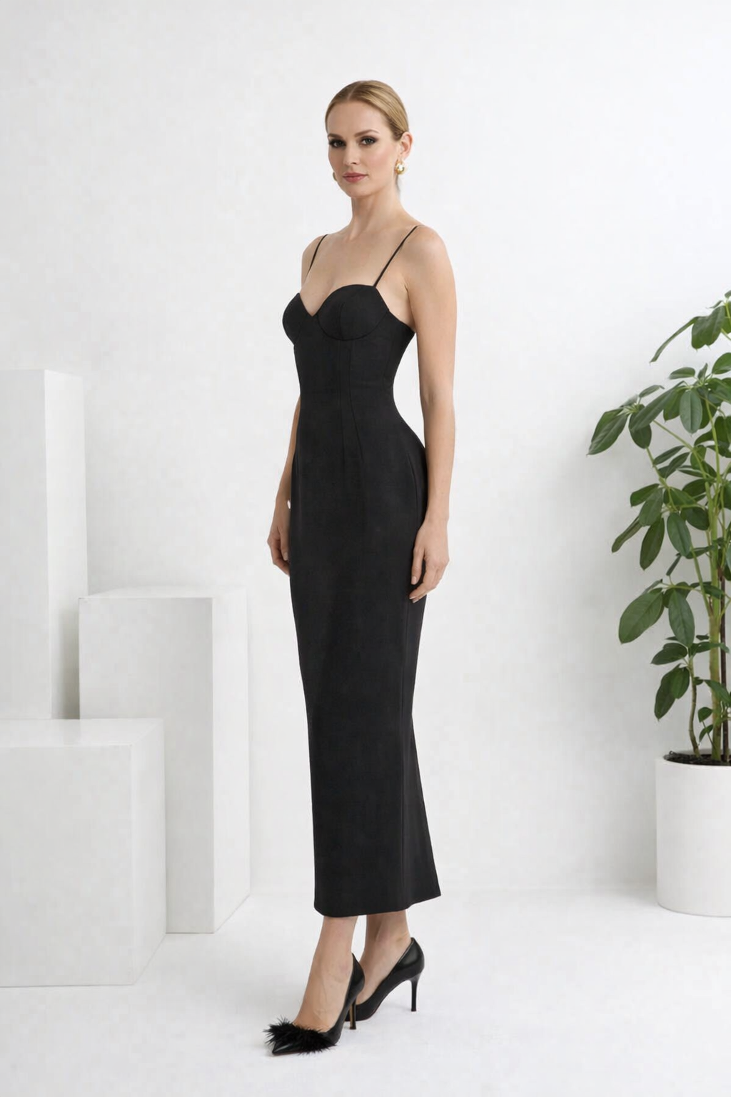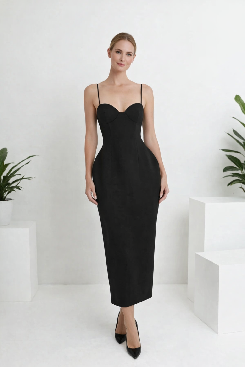 Das Noir Contour Midi Kleid verkörpert zeitlose Eleganz mit einem modernen, femininen Touch. Das strukturierte Bustier-Oberteil mit schmalen Trägern betont die Silhouette und formt eine schmeichelnde Kontur, ohne dabei an Leichtigkeit einzubüßen. Gefertigt aus hochwertigen Mischgeweben mit glatter Oberfläche, fällt das Kleid fließend und legt sich sanft an den Körper an – für eine edle, mühelose Ausstrahlung. Die Midilänge setzt dezente Akzente und macht dieses Kleid zur perfekten Wahl für Cocktailabende, besondere Anlässe, elegante Dinner-Dates oder einen stilvollen Übergang vom Day-to-Night-Look. Ein vielseitiges Statement-Piece für Frauen, die schlichte Raffinesse schätzen.