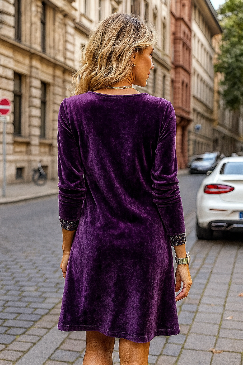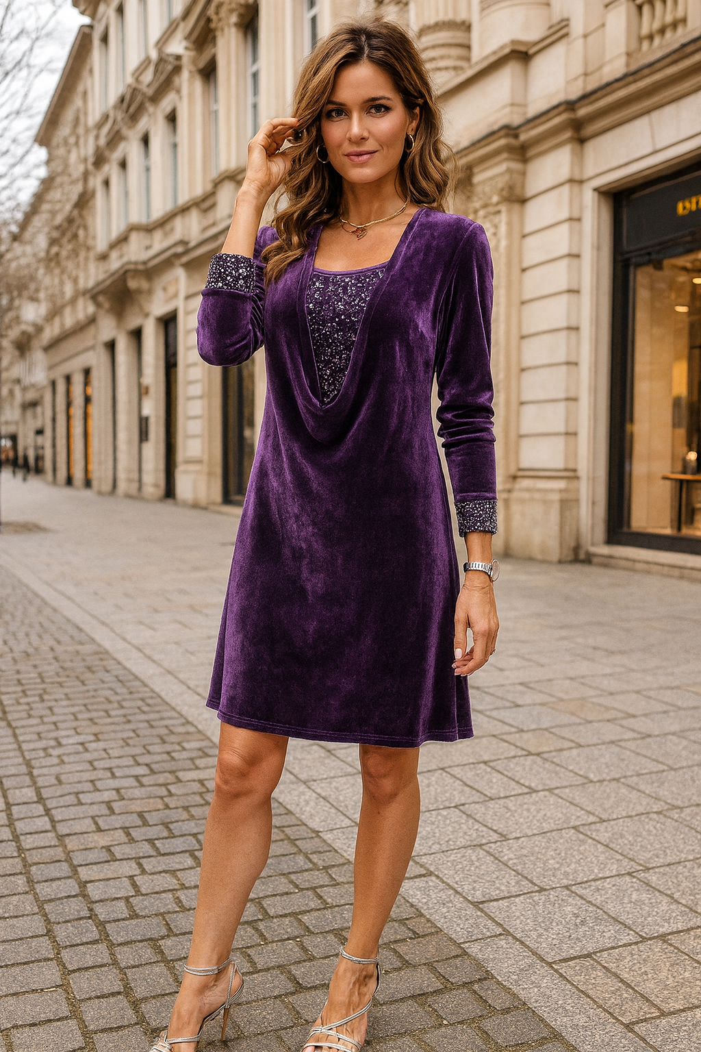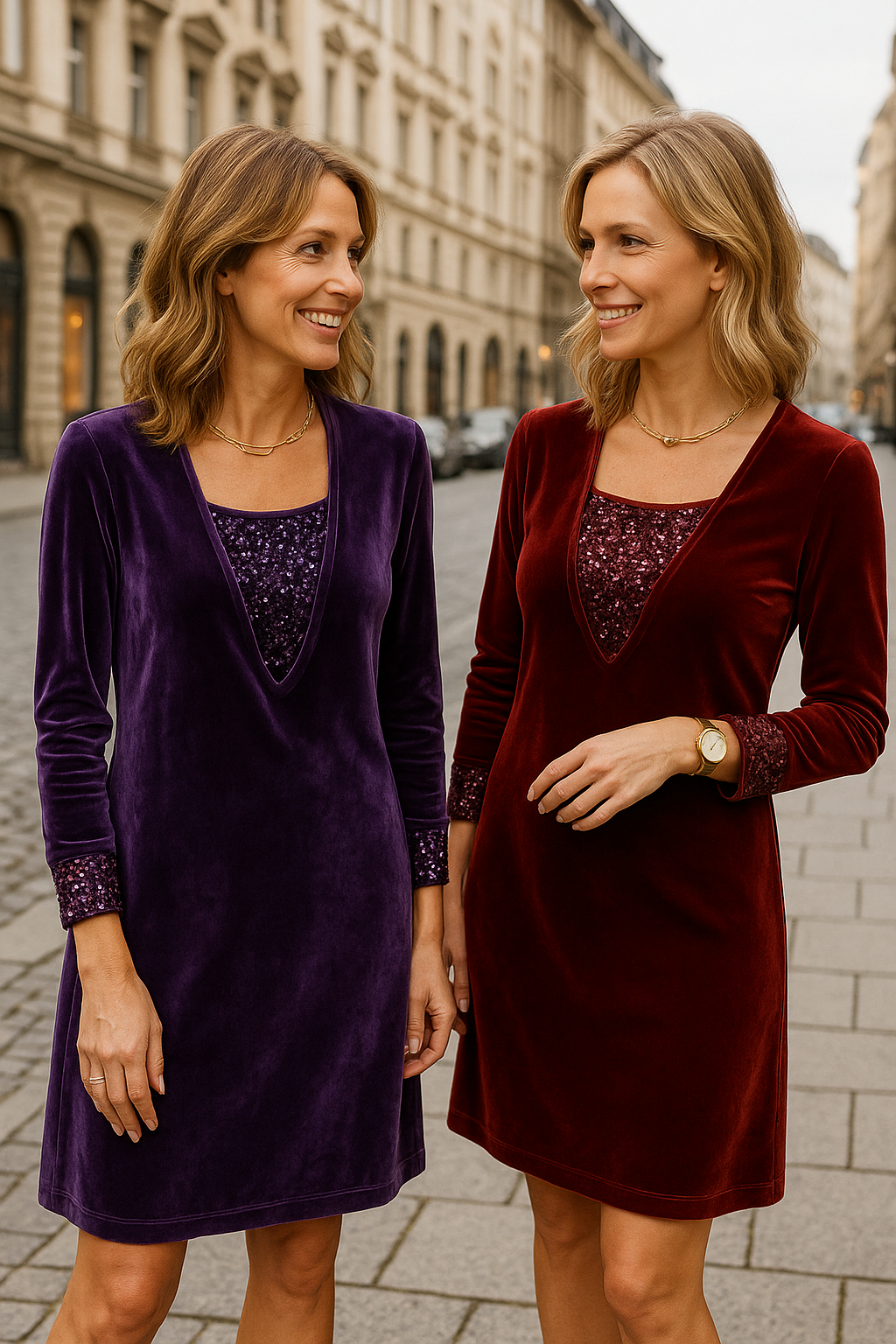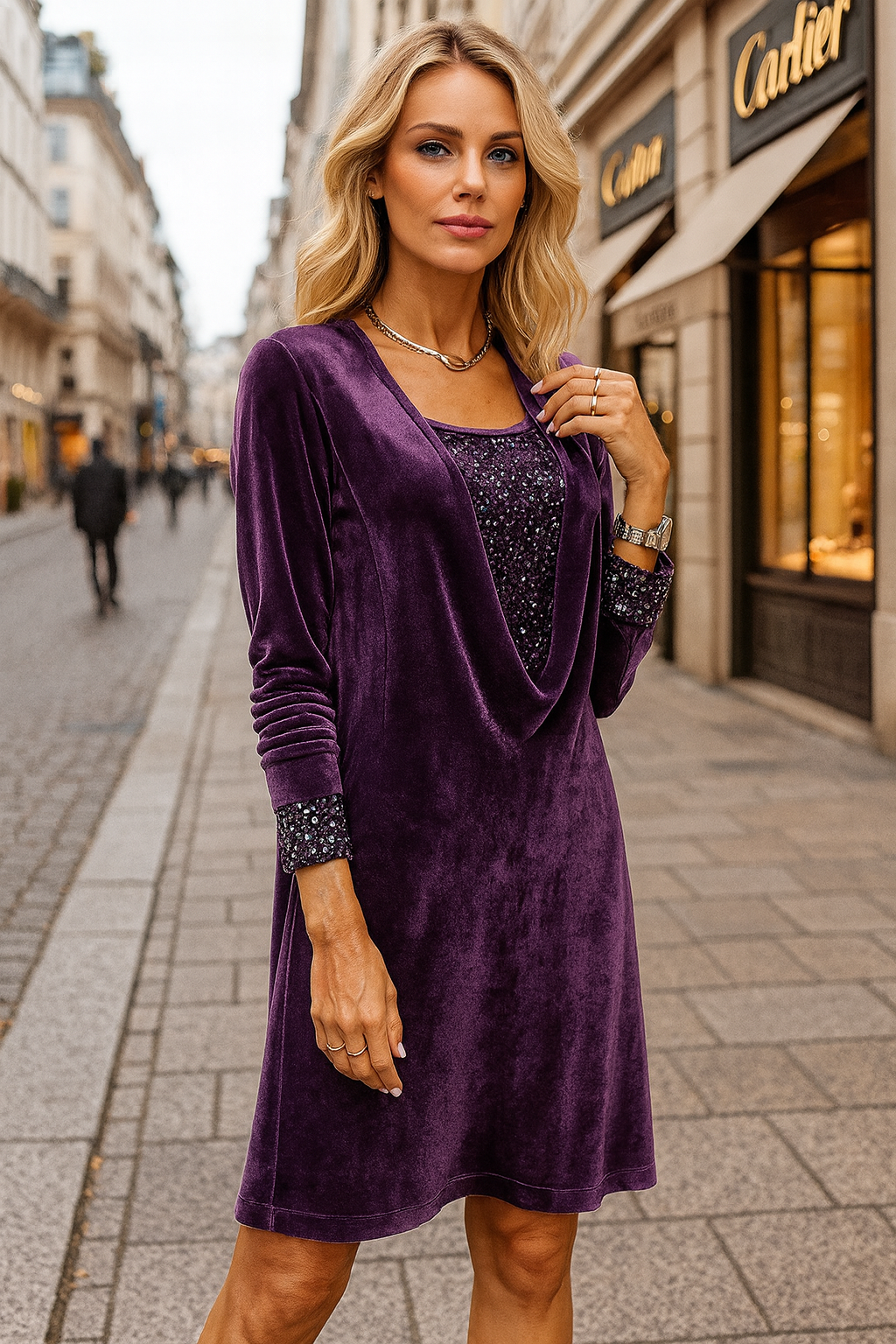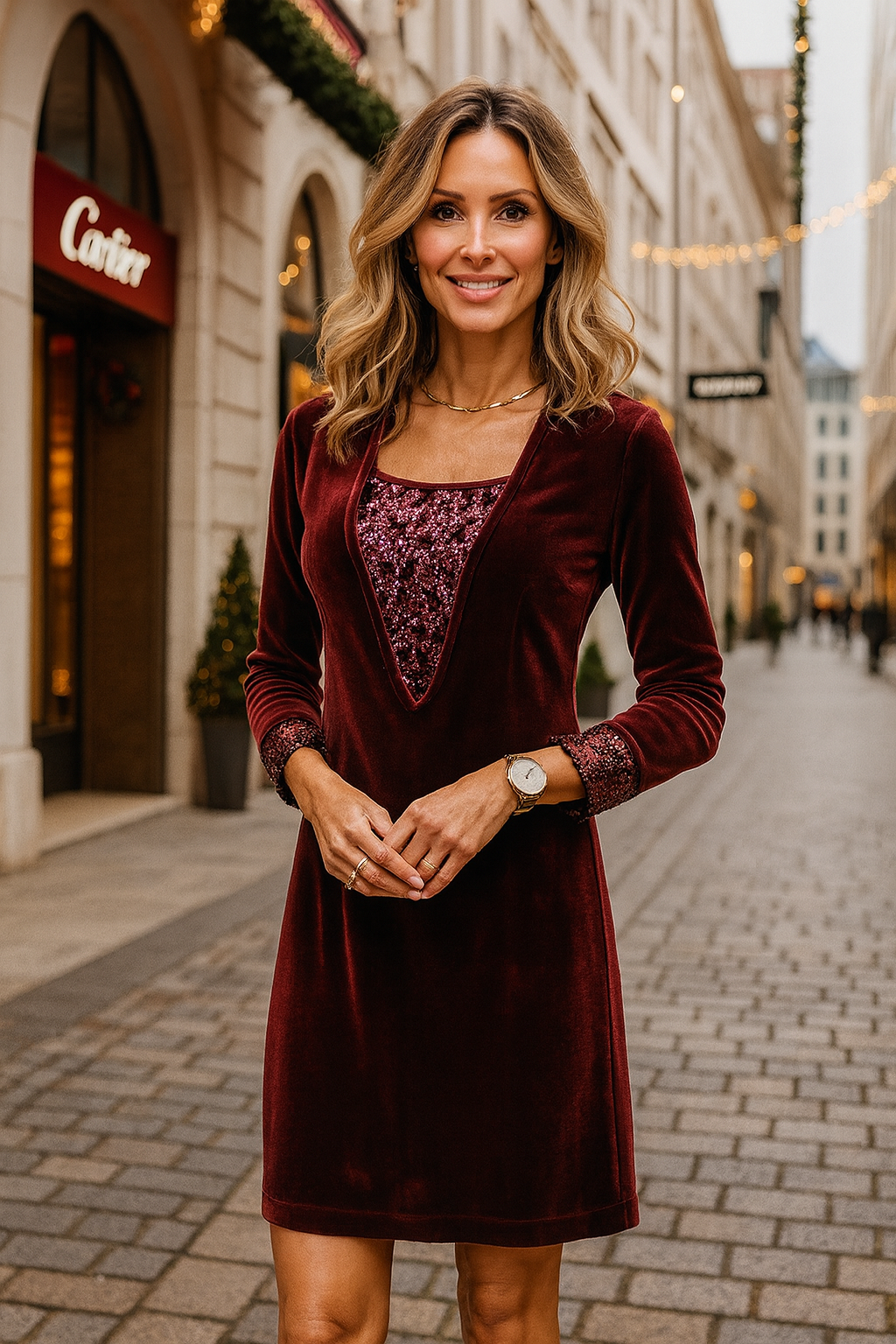 Der dezent freizügige Ausschnitt mildert den schweren Eindruck des Samts, während die mit Pailletten gefütterte Lage (die die Manschetten widerspiegelt) einen mehrschichtigen Reiz verleiht, ohne protzig zu wirken.