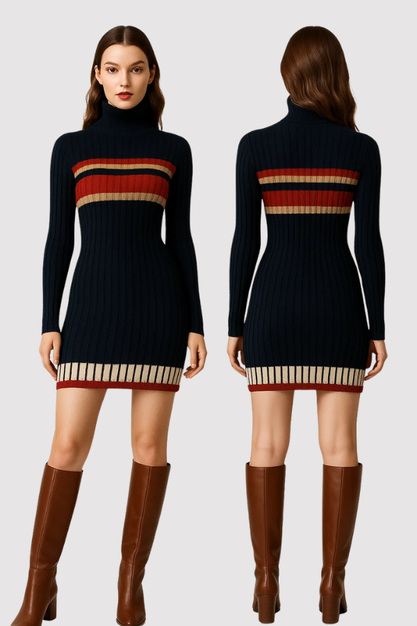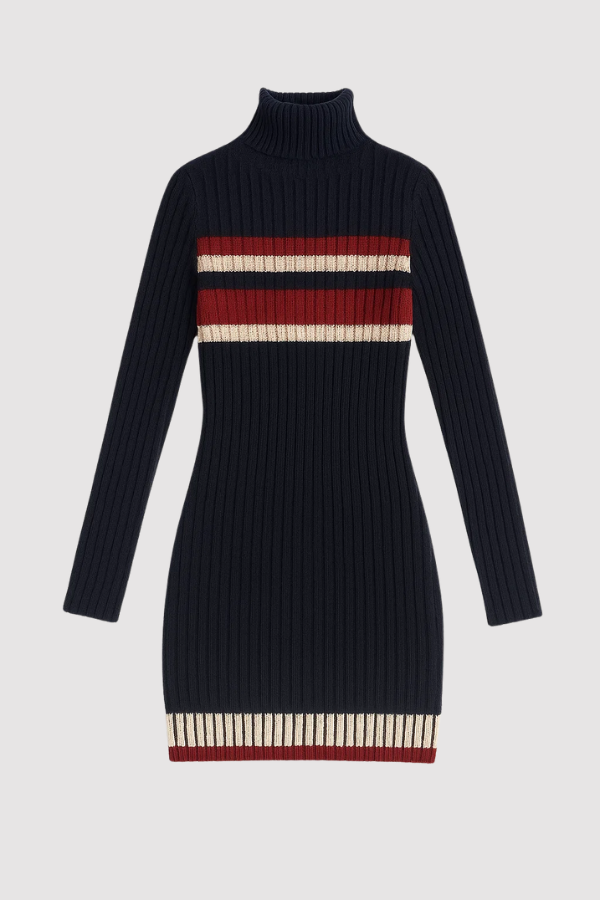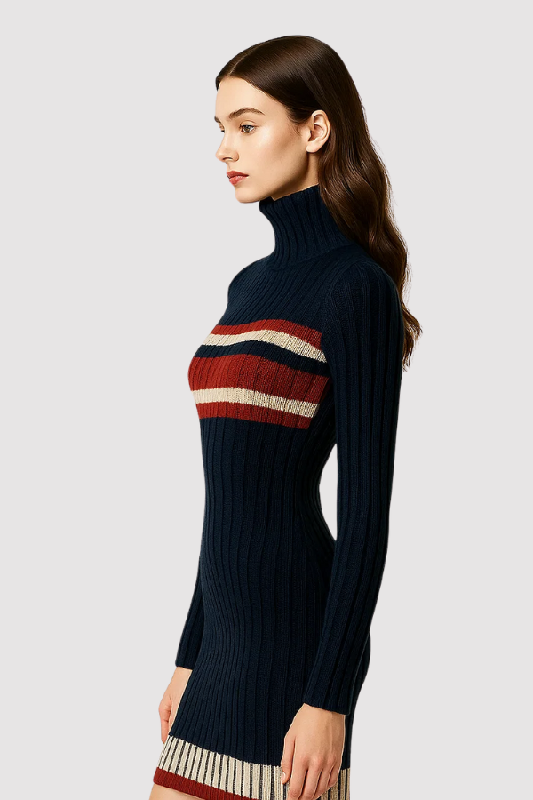 Unser Retro-inspiriertes Kleid mit roten, weißen und blauen Streifen vereint klassische Eleganz mit modernem, sportlichem Stil. Der hohe Kragen und das farblich abgesetzte Streifenmuster unterstreichen die individuelle Note, während die figurbetonte Passform die Körperlinien schön betont. Dieses modische Strickkleid bietet hohen Tragekomfort und ist ideal für alle, die ihrem Alltagslook einen lässigen, stilvollen Akzent verleihen möchten.