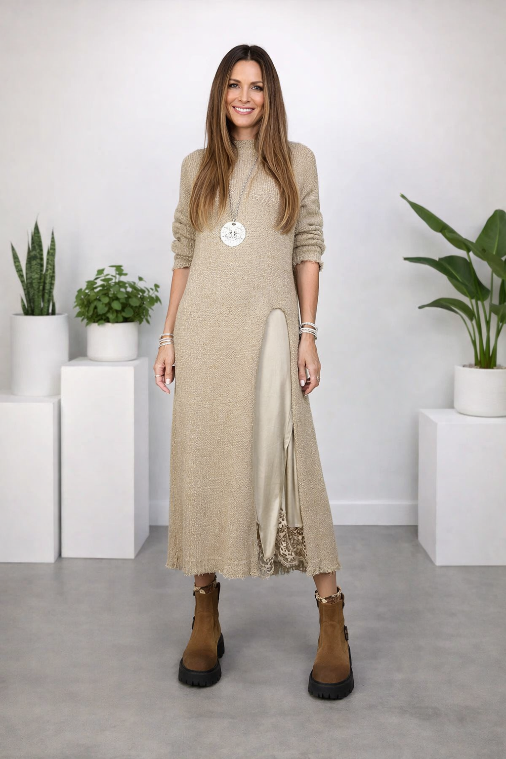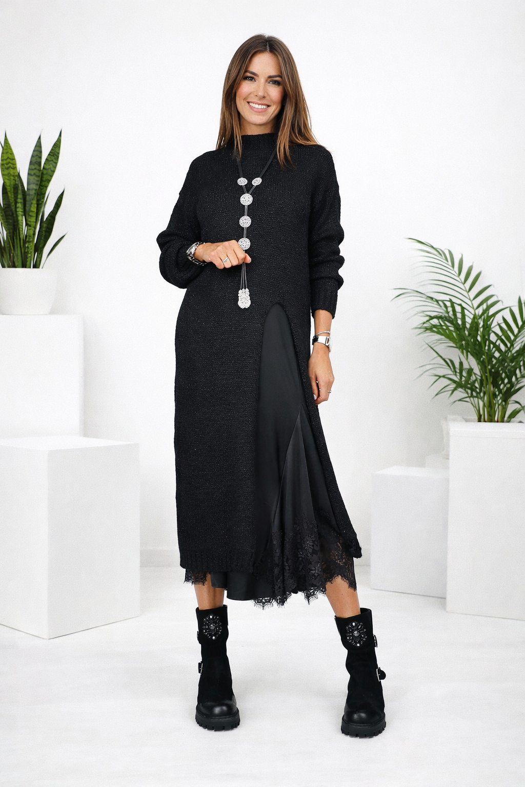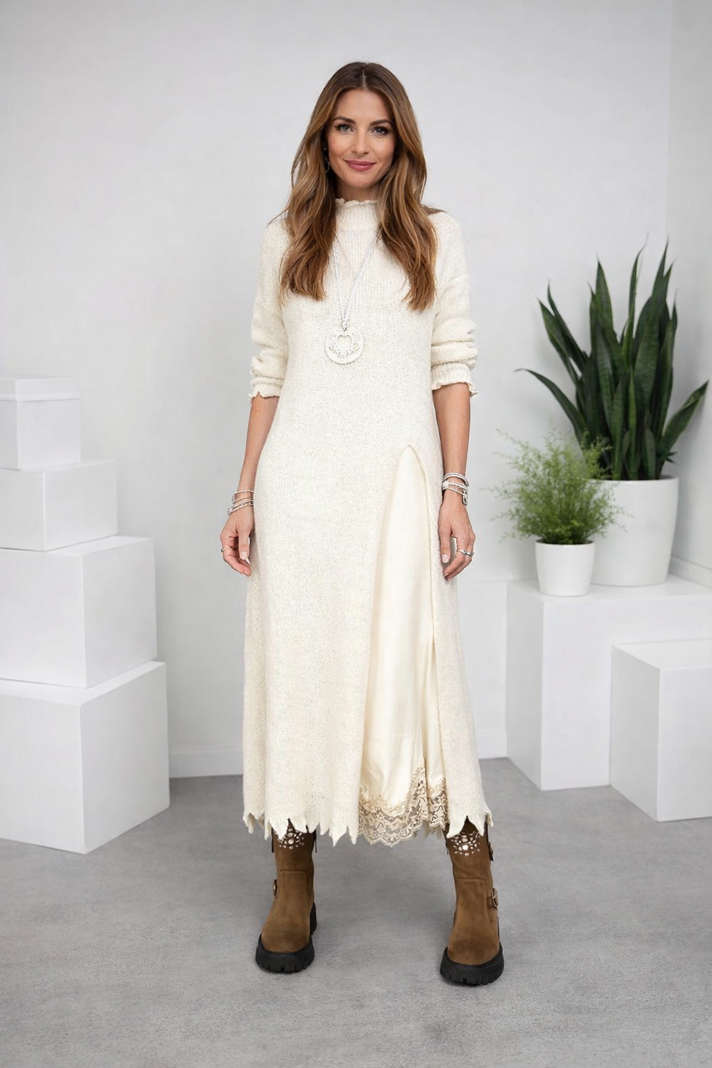 Das Valérie™ Set vereint die fließende Leichtigkeit von Satin mit der sanften Wärme eines handgearbeiteten Strickpullovers. Dieses Duo steht für den modernen, mühelosen Stil der europäischen Frau – elegant, komfortabel und voller Charme. Das Satin-Unterkleid schmiegt sich zart an den Körper an, während der lange Strickpullover eine harmonische Silhouette mit gemütlicher Raffinesse schafft.