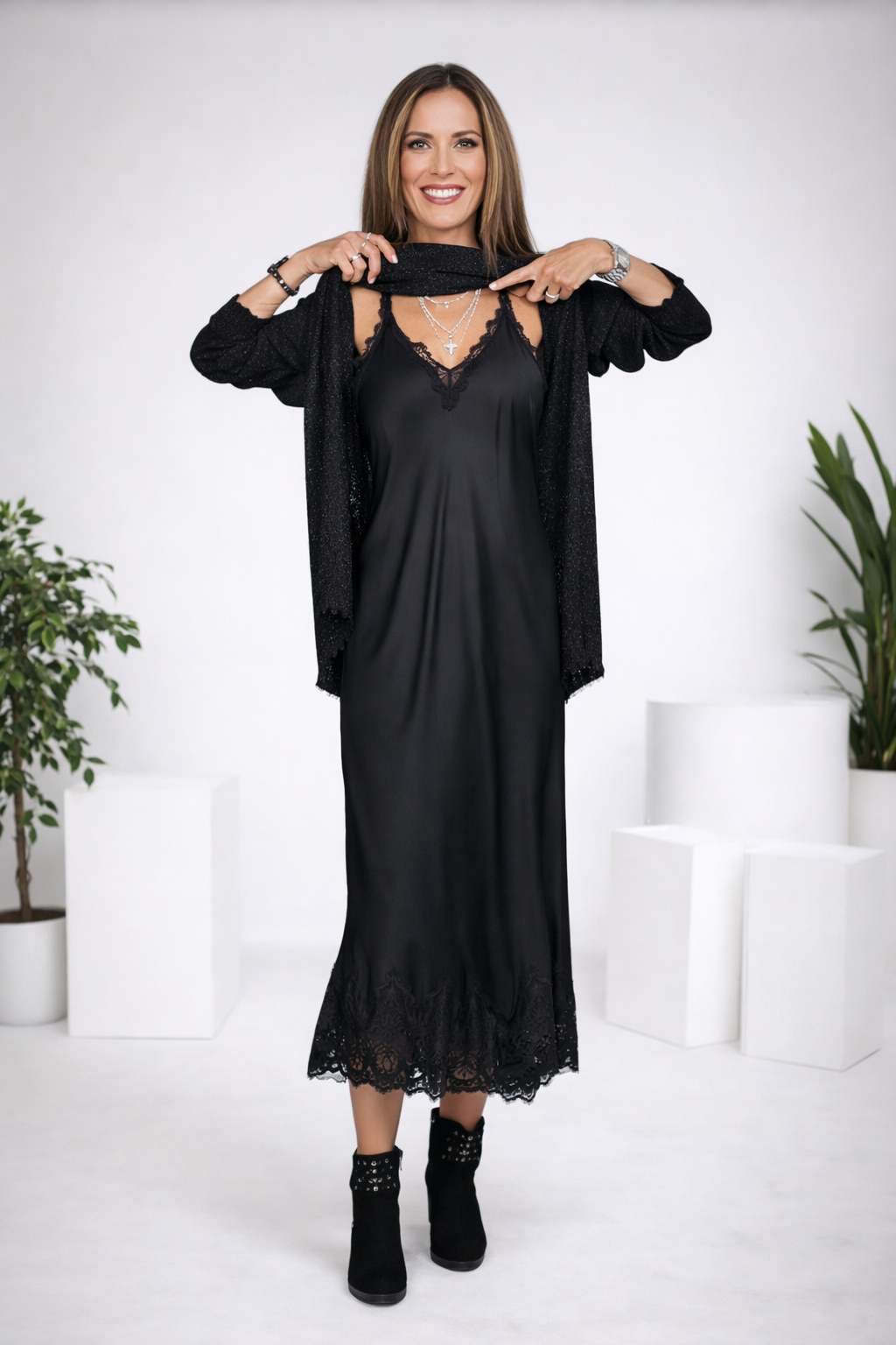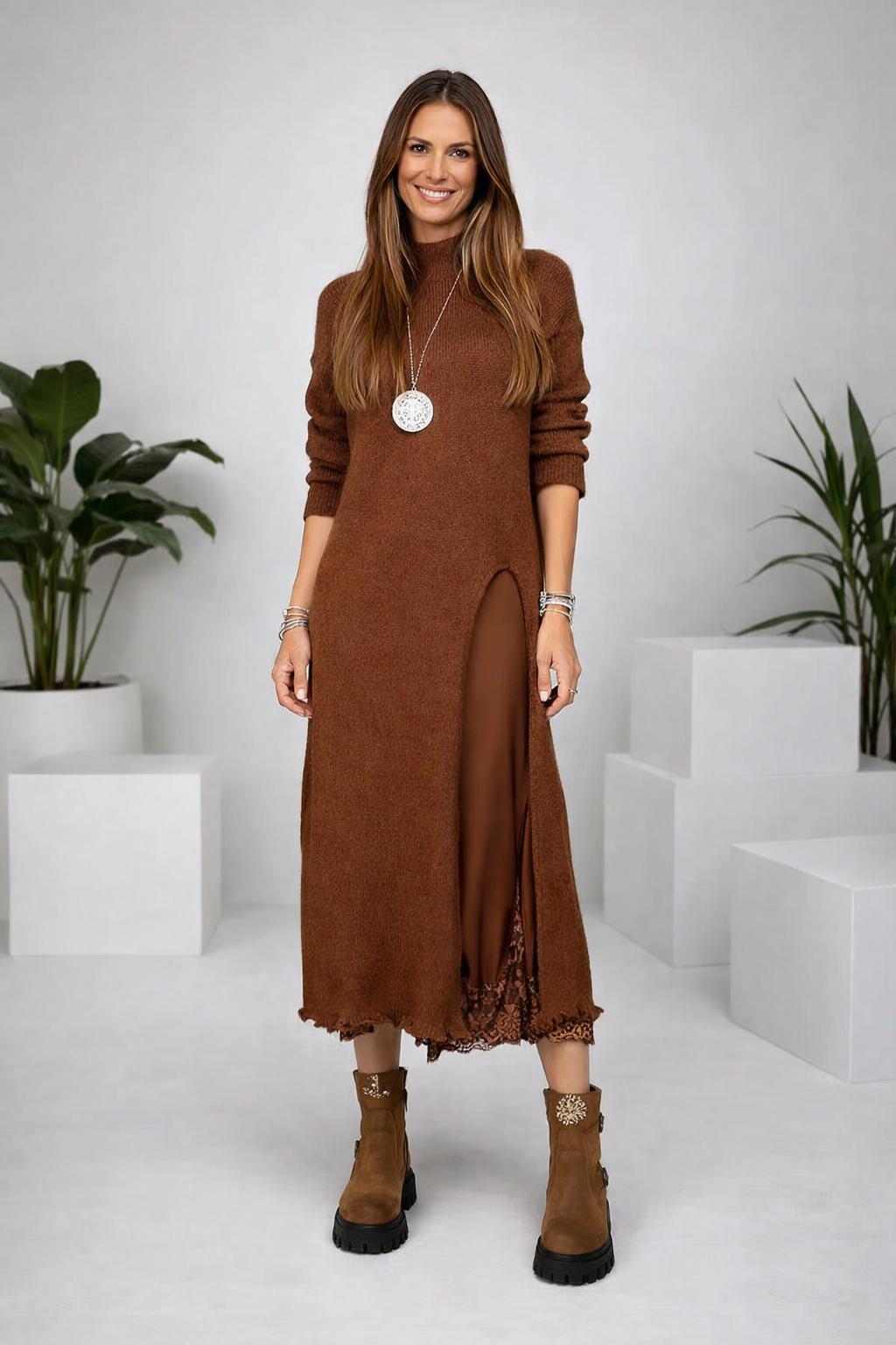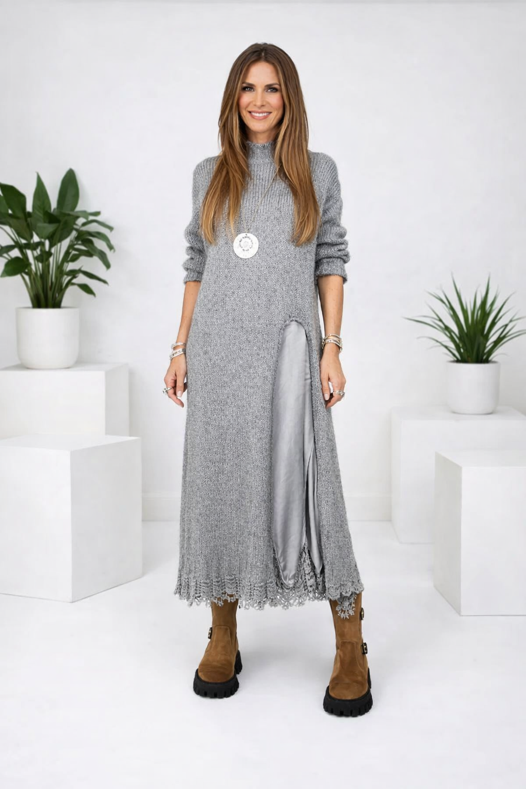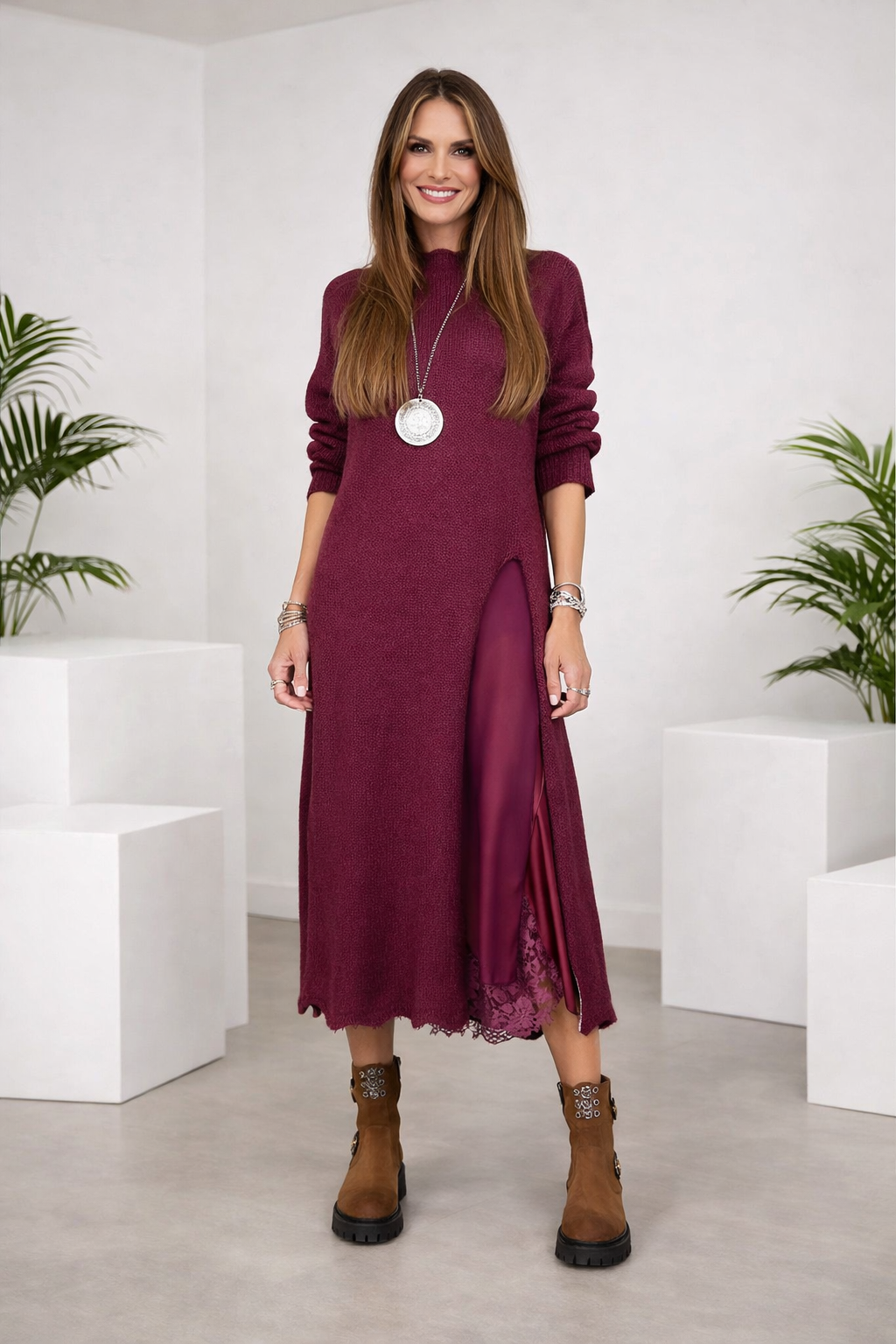 Das Valérie™ Set vereint die fließende Leichtigkeit von Satin mit der sanften Wärme eines handgearbeiteten Strickpullovers. Dieses Duo steht für den modernen, mühelosen Stil der europäischen Frau – elegant, komfortabel und voller Charme. Das Satin-Unterkleid schmiegt sich zart an den Körper an, während der lange Strickpullover eine harmonische Silhouette mit gemütlicher Raffinesse schafft.