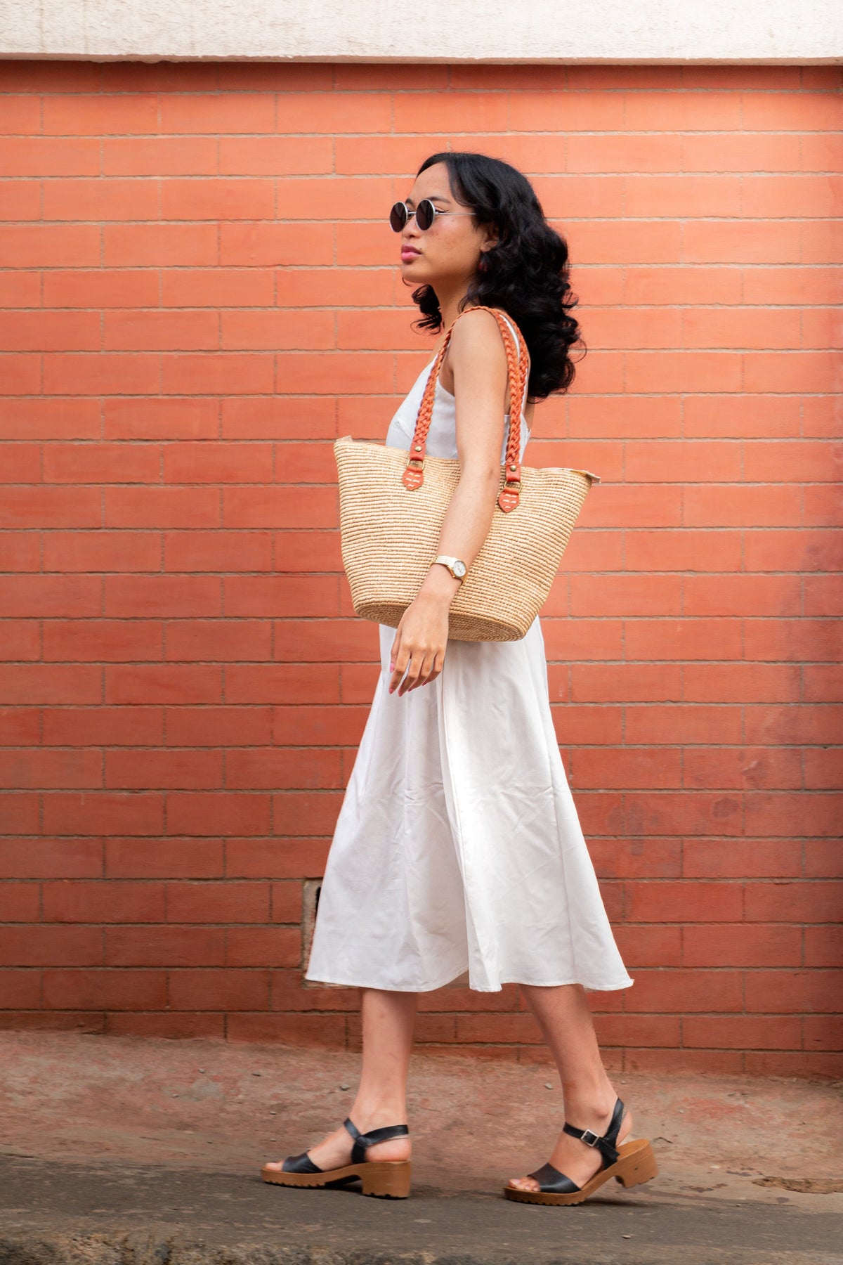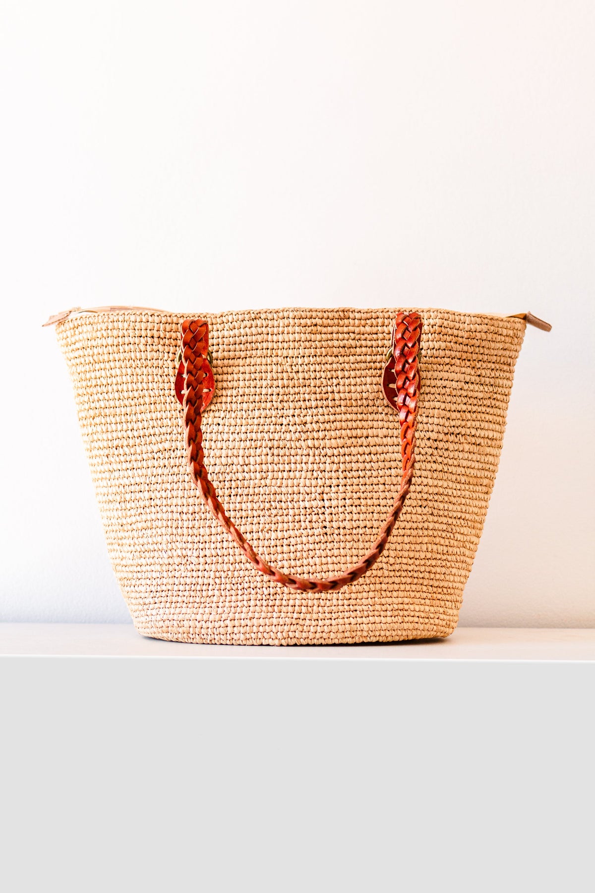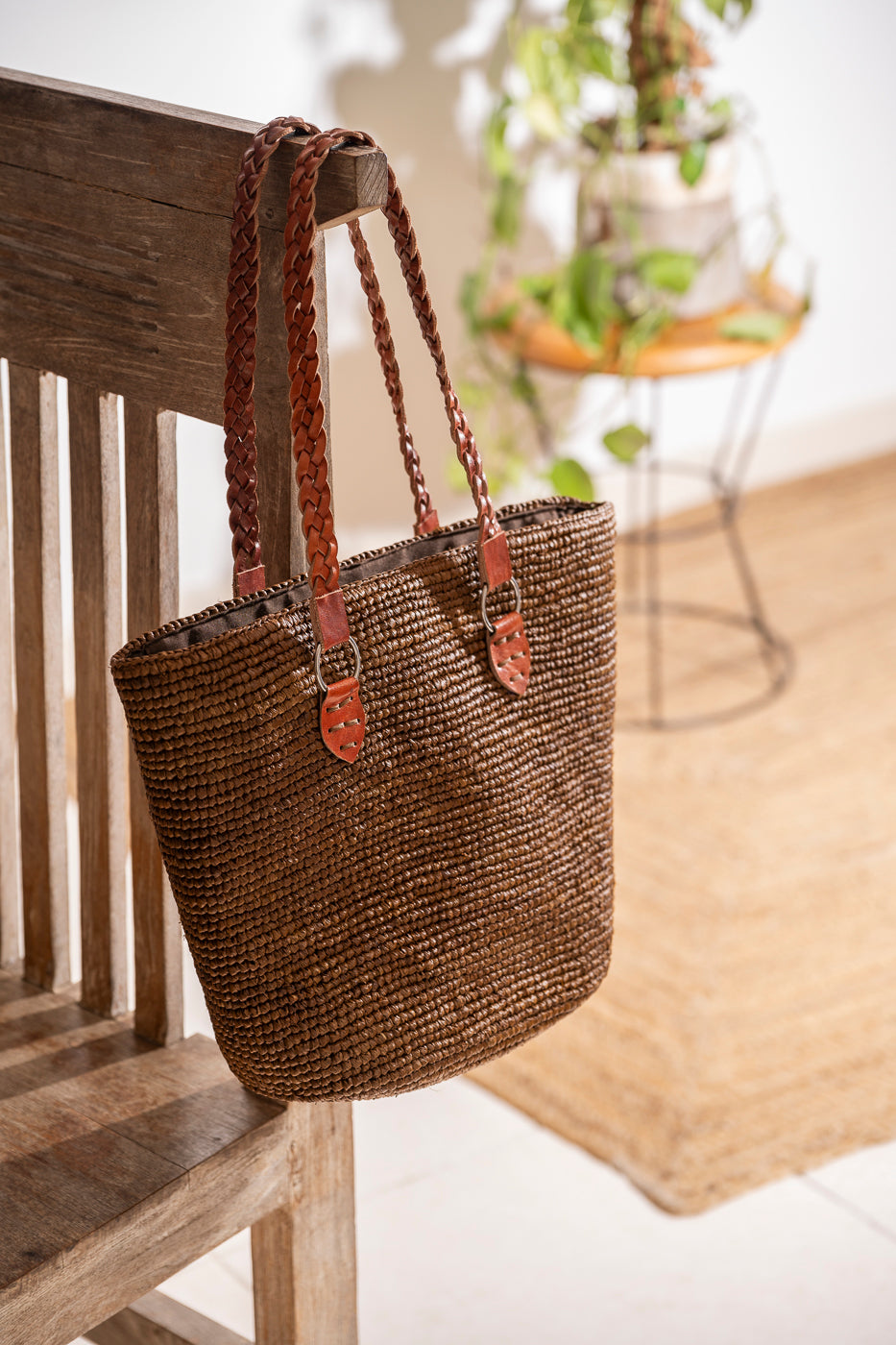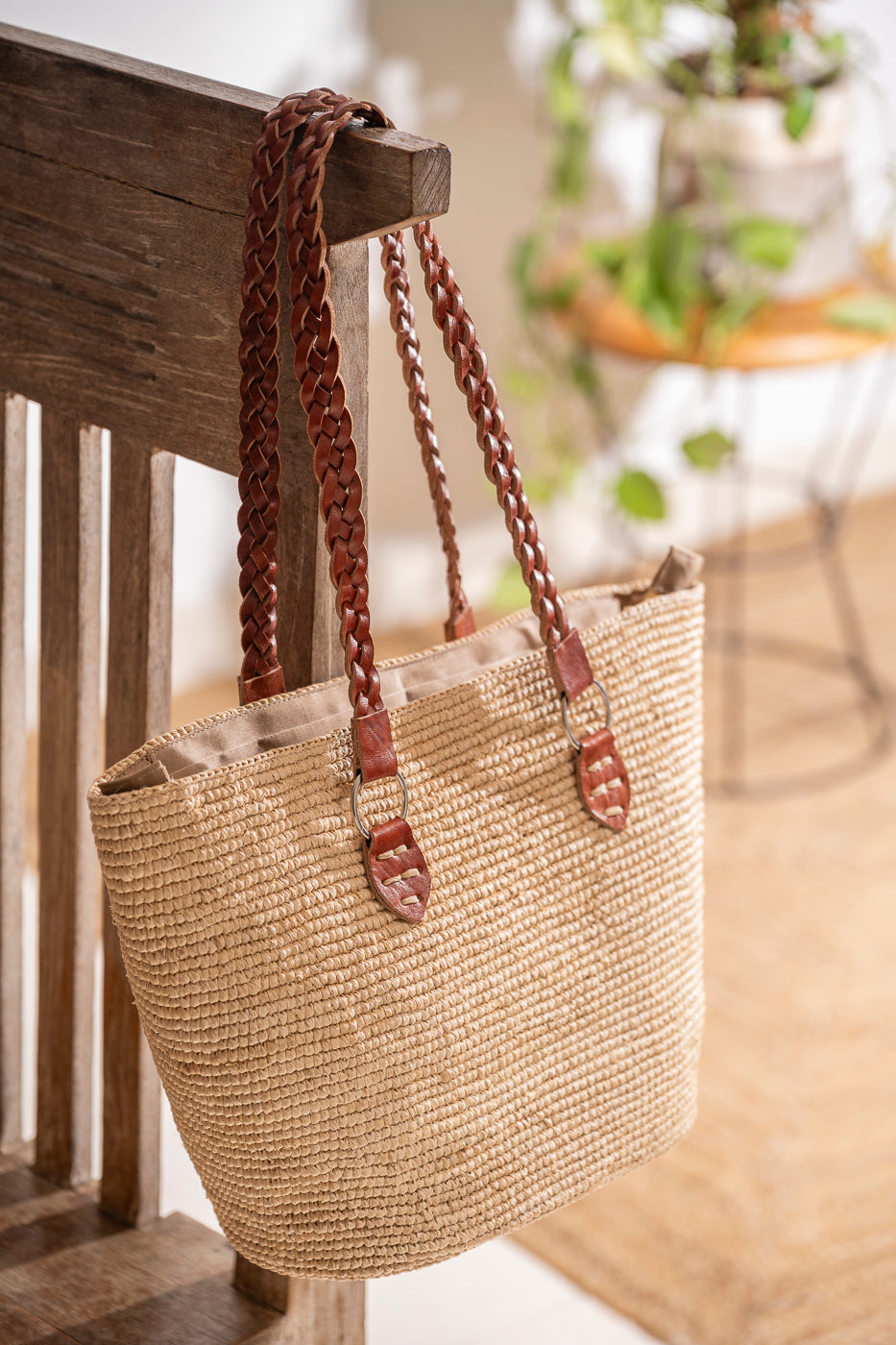 Handgefertigt aus natürlichem Raphia verkörpert die Tasche Soa die Begegnung von Tradition und Moderne. Ihre geflochtenen Lederhenkel verleihen ihr Charakter und Raffinesse und machen diese Einkaufstasche zu einem zeitlosen Begleiter für die Stadt sowie für Ihre sonnigen Ausflüge.Leicht und geräumig bietet Soa Platz für all Ihre Essentials mit Eleganz. Ihr Innenfutter aus Bio-Baumwolle und die diskrete Innentasche bieten praktische Handhabung und Komfort im Alltag, während die Lederdetails die Einzigartigkeit ihres Designs unterstreichen.Jede Tasche ist ein Unikat, das handwerklich in unserer Werkstatt in Madagaskar gefertigt wird. Die Unregelmäßigkeiten im Geflecht und im Leder spiegeln die ganze Schönheit und Authentizität des lokalen Handwerks wider.Abmessungen :