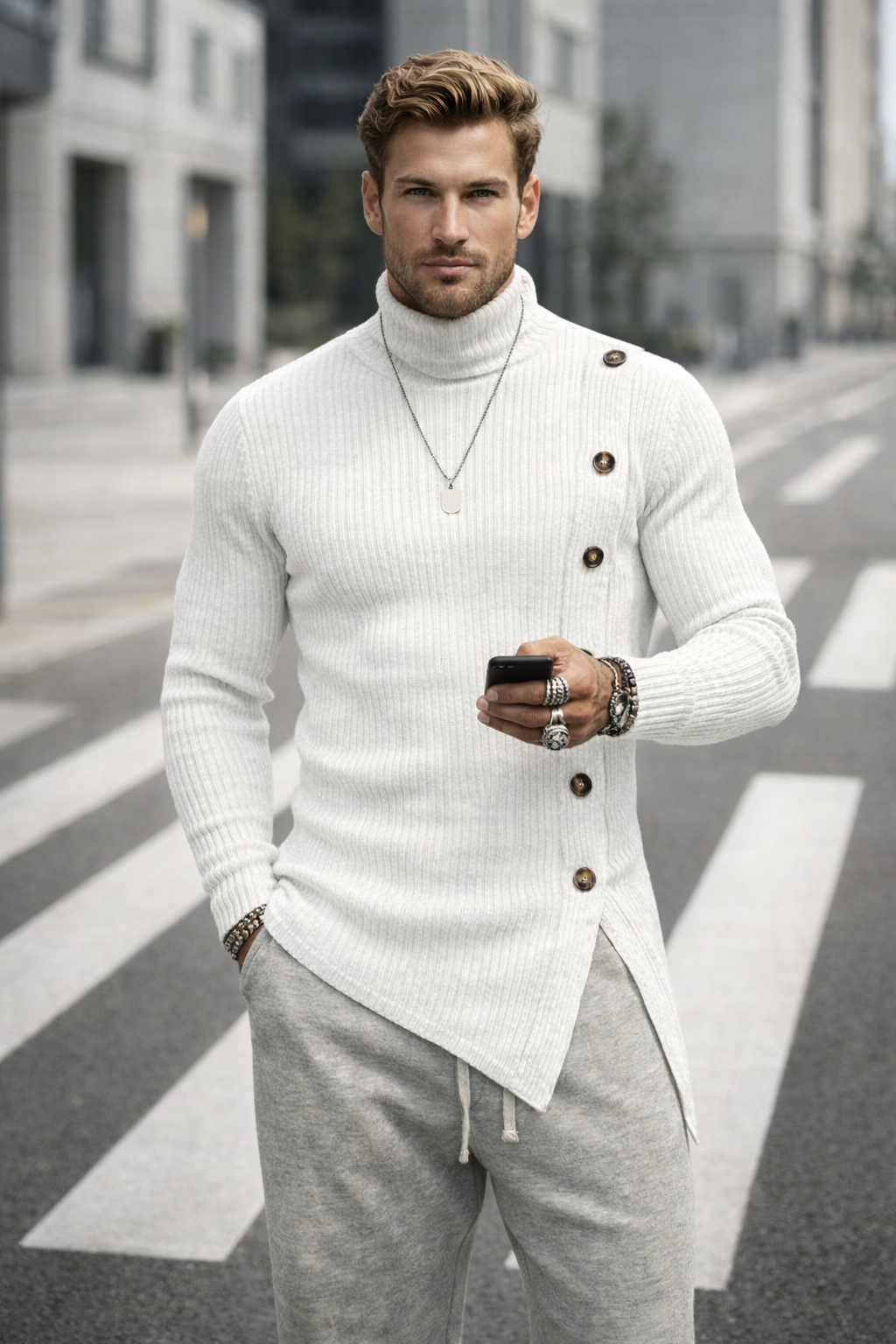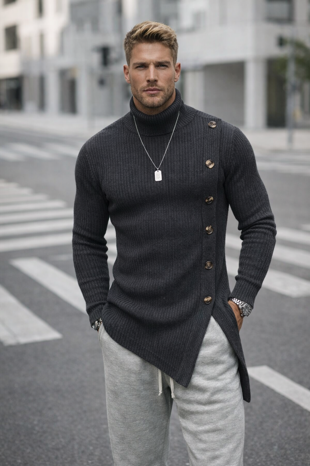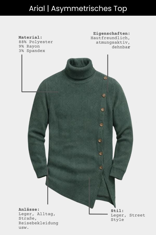 • Design: Elastisches Strickmaterial, Rollkragen, asymmetrischer Saum, Knopfakzente
