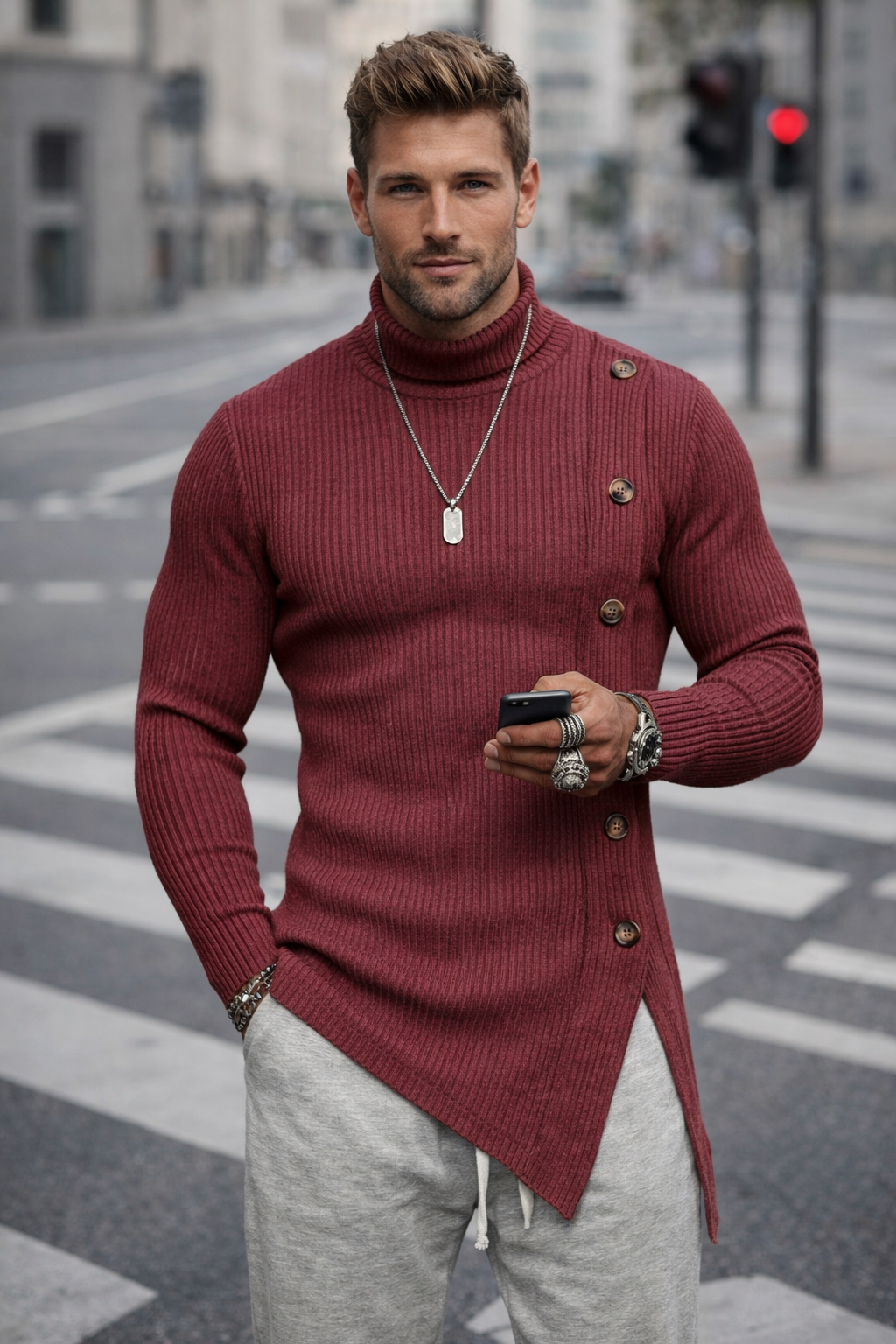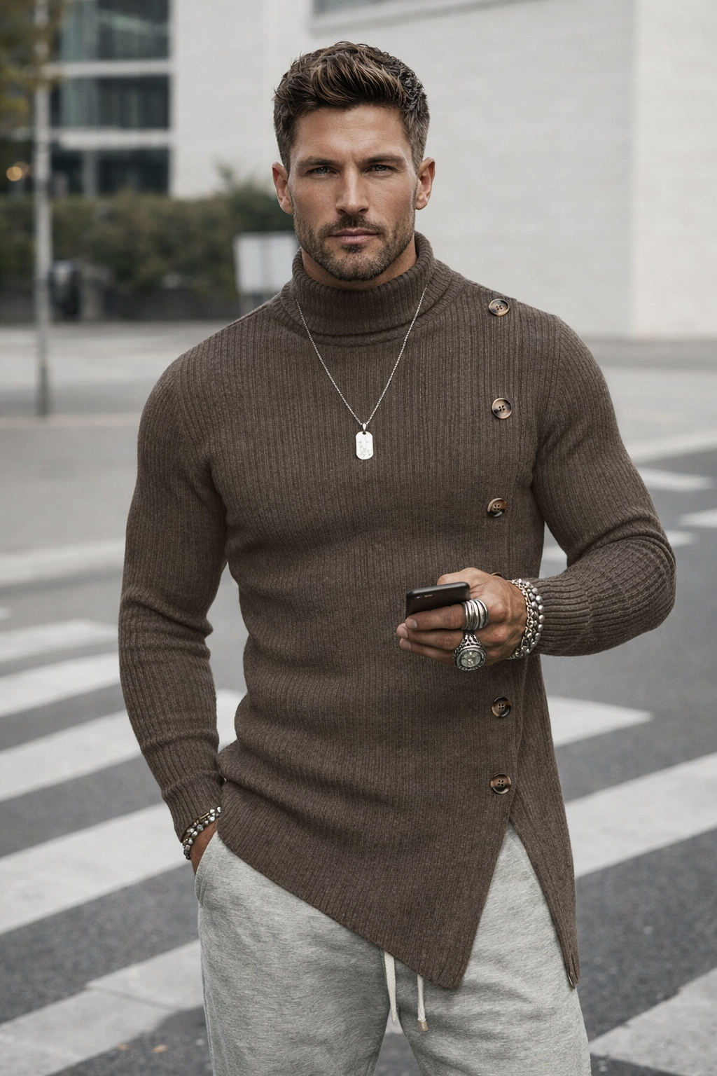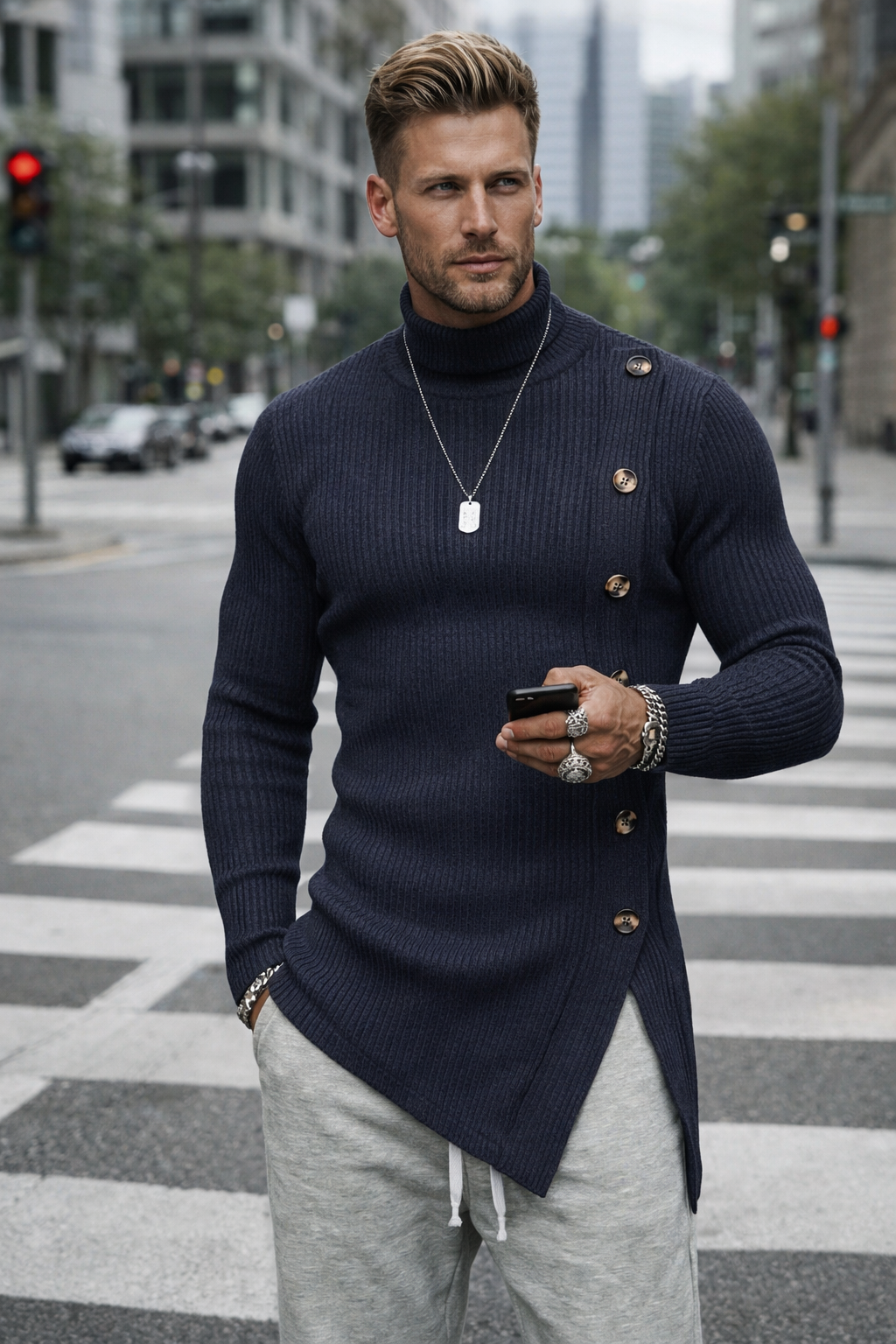 • Design: Elastisches Strickmaterial, Rollkragen, asymmetrischer Saum, Knopfakzente