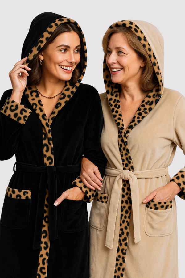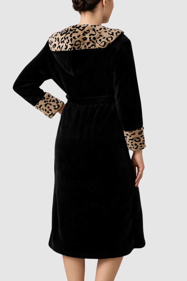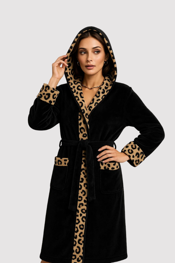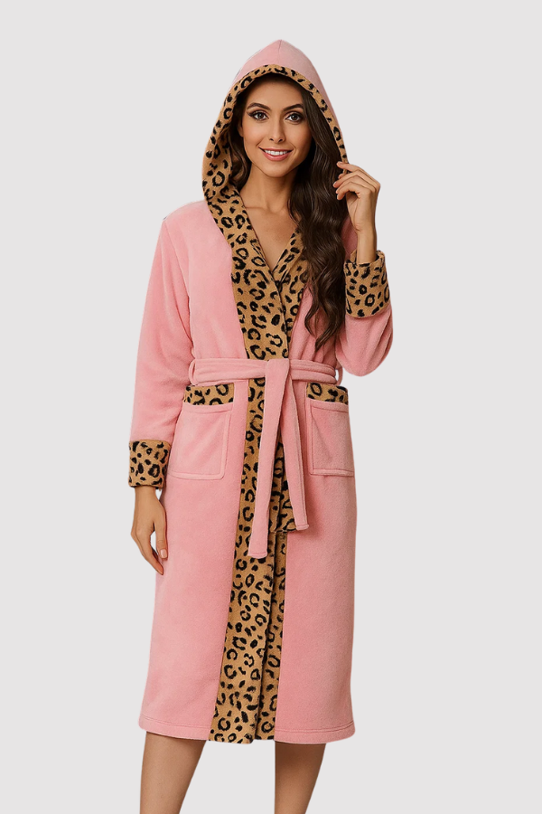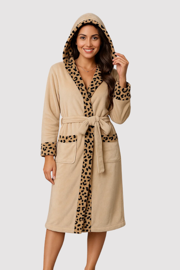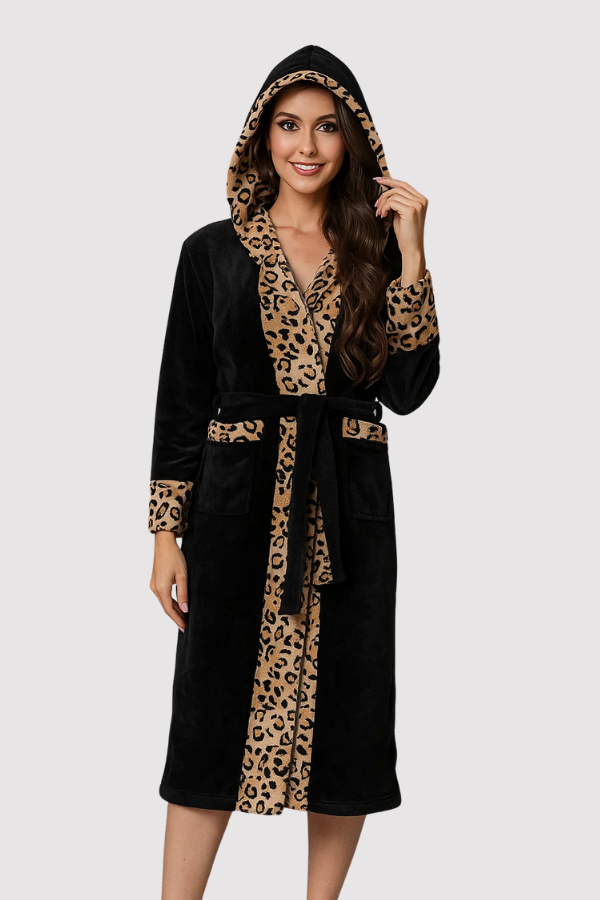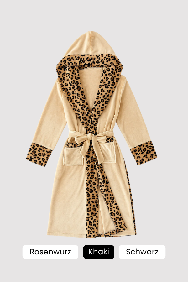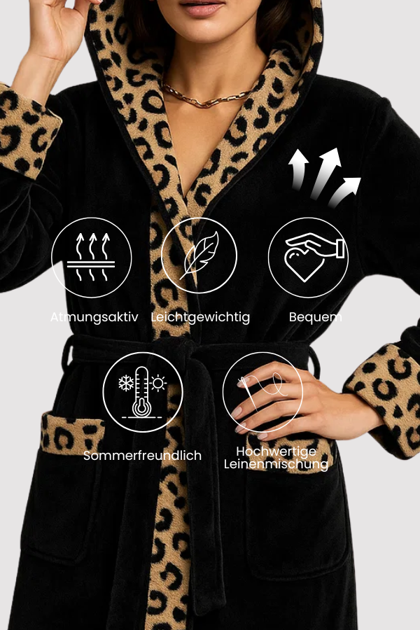 Lieferumfang: 1 x gemütlicher Damen-Bademantel mit Kapuze und Leopardenmuster.